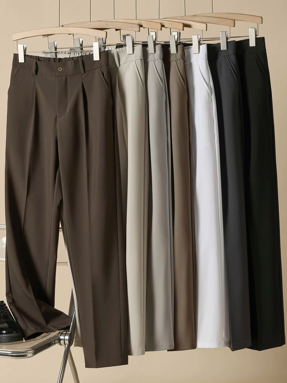 Available in seven elegant shades – dark brown, light gray, medium gray, taupe, white, charcoal gray, and black – this collection ensures you’ll find the perfect match for any outfit. Each pair features a tailored fit, secure waistband, and classic crease detailing, making them a staple in any modern man’s wardrobe.